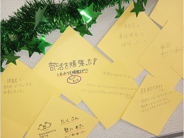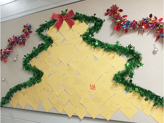 ツリーの中の黄色い紙には、生徒たち一人一人が今年頑張ったことが書いてあります。
