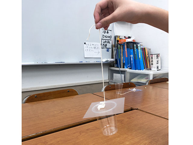 ビー玉が入ったコップを薄いプラスチックのシートが持ち上げている様子に子どもたちは興味津々!