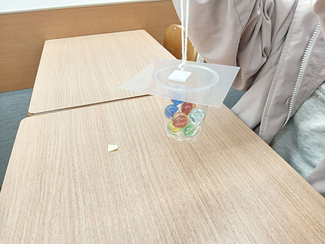 カップの中の気圧を下げることによって、なんと!ビー玉の入ったカップが持ち上がる!