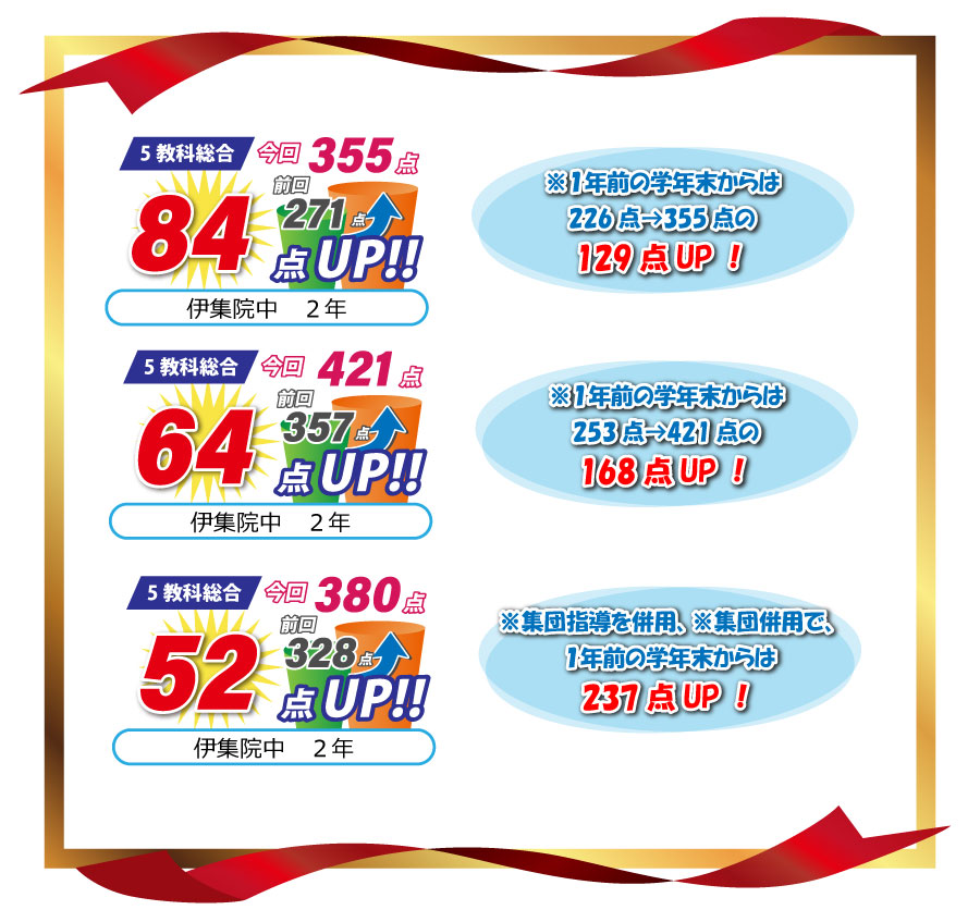 先日おこなわれた後期期末・学年末テストにおいて、伊集院校の個別生も前回テストから驚異の上昇を果たしました!