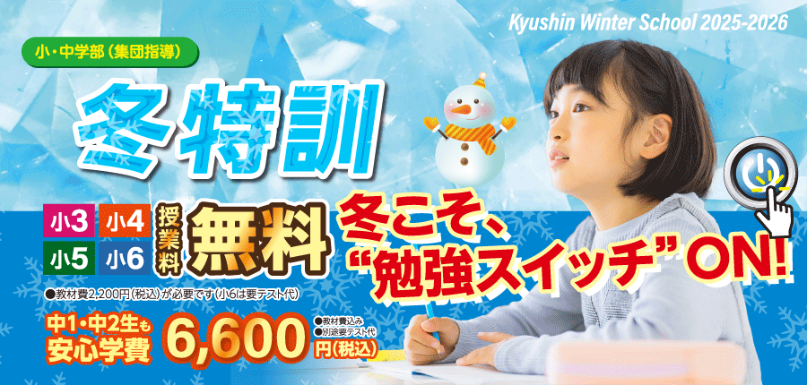 たくさんの小学生に九進の授業を受けてもらいたい!勉強の楽しさを知ってほしい!という思いから、今年の冬も授業料無料での開講です。※教材費2,200円が別途必要です。