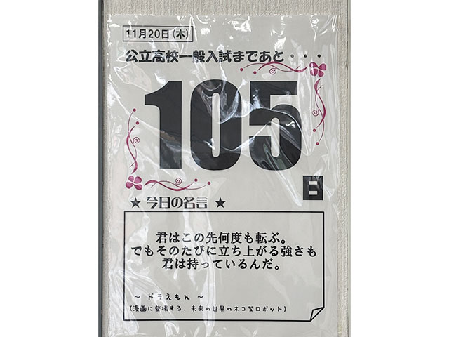 11月20日から、今年も中3の入試カウントダウンを始めました! 今年は、例年より少し早めの入試まであと105日のタイミングからスタートです。