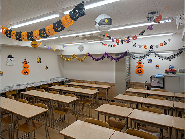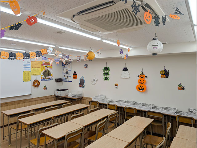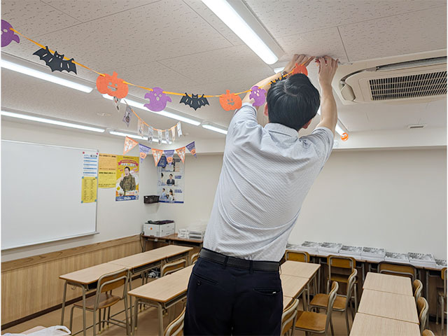 写真は今年のハロウィンパーティーに向けた飾りつけの様子です!