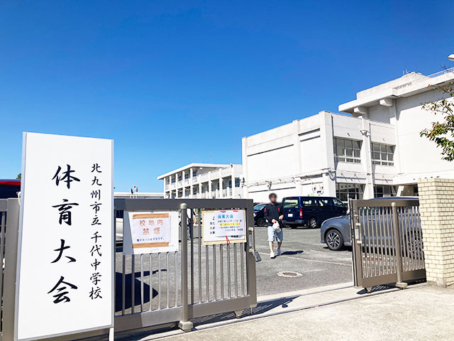 都市高速横の坂道をえっさほいさと登っていくと、見えてきました千代中学校!