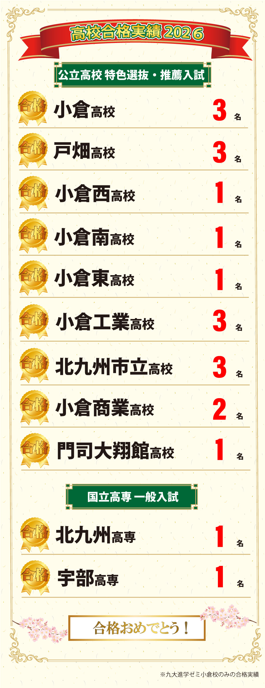 公立高校特色選抜・推薦入試結果&国立高専一般入試結果 公立高校の特色選抜・推薦入試結果が2月9日(月)に、高専一般入試結果が2月8日(月)・12日(木)に発表されました。 合格おめでとう!本当によかった!!よくがんばったね。 小倉校トップへ 小倉校ブログトップへ