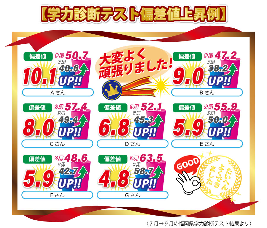 夏の努力が実る秋! 夏休みから本格的な受験勉強をスタートさせた中3生たち。夏の頑張りがいよいよ結果に出始めています。暑さに負けず、集中して臨んだ「授業」、毎日取り組んだ「日々の宿題」や「100問トレーニング」、ライバルと競い合った「夏期1Day合宿」。その一つひとつの努力の積み重ねが今、確実に『実力』へと変貌を遂げています。 しかし、受験まではまだ長い道のり…。さらなる高みを目指して、努力を続けていこう! 姪浜校トップへ 姪浜校ブログトップへ