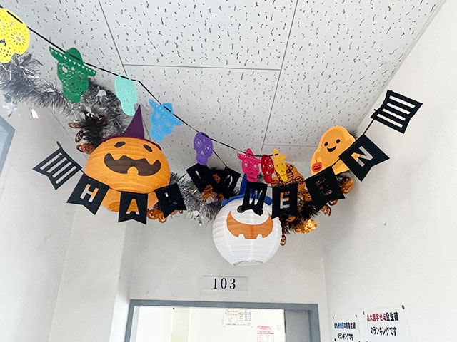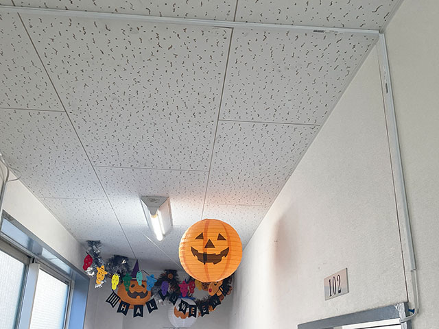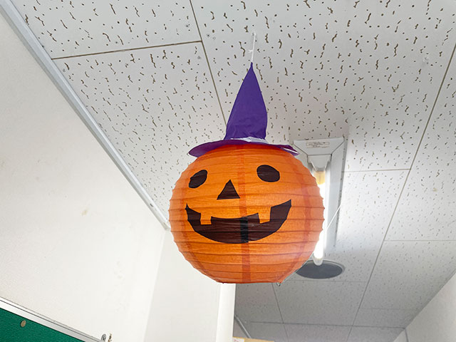 10月の「ハロウィンパーティー」にむけて、会場となる教室へつながる廊下にも、ちょっとずつオバケやカボチャがお目見えしていますね。