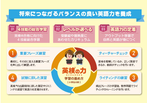 タブレットを用いた学習を基軸に、将来にわたって通用する英語力を育てるとともに、英検🄬の取得をめざしていきます。