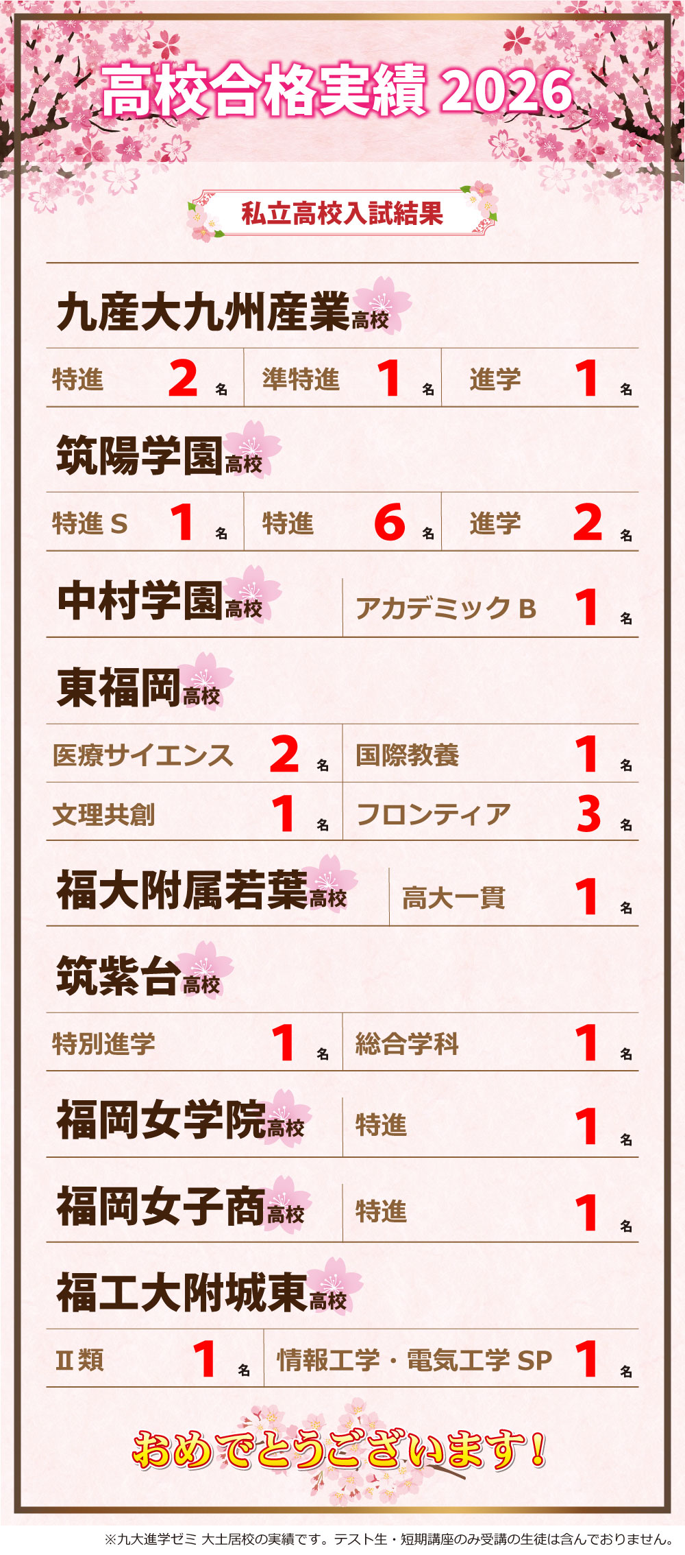 ❀私立高校入試結果❀ こんにちは!九大進学ゼミ大土居校です。 大土居校校の私立高校の入試結果を発表します! 専願入試・前期入試を併せた結果です! 合格を勝ち取ったみんな!おめでとう🌸 大土居校トップへ 大土居校ブログトップへ