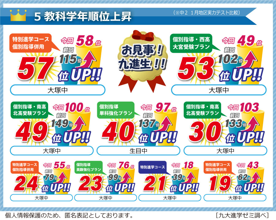 特別進学コース(集団指導コース)は、中1時より、高校受験・大学受験を意識した指導カリキュラムで指導していますが、最後の地区実力テストでも、好結果を出すことができました!