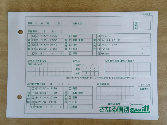 指導内容や連絡事項も毎回詳細に記載して、本人と保護者に渡しています