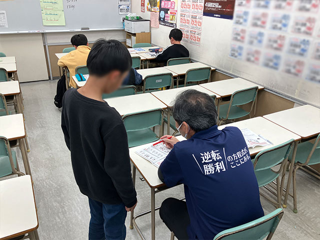 タブレットで解説動画を見ながら問題を解き、教師が丸つけ・解説を行います。