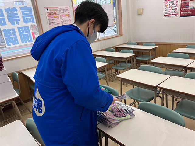 この写真は塾長の岡谷先生が春期講座のチラシを配るために準備しているところです!