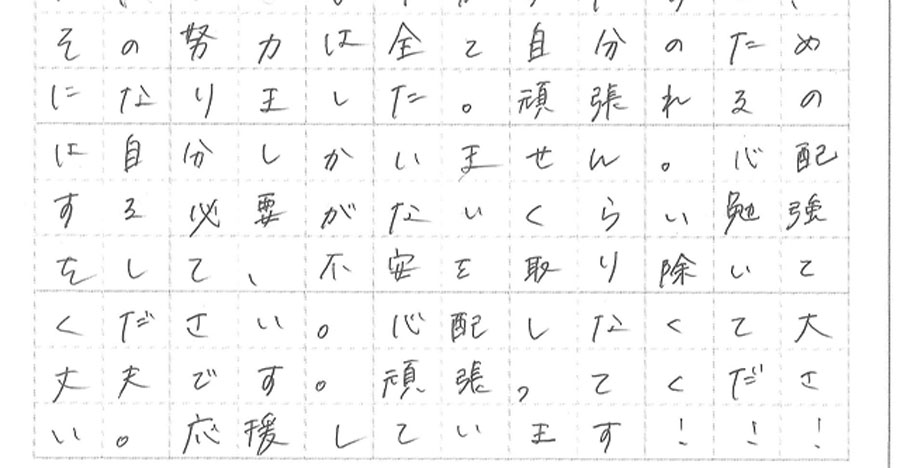 「私は、落ちたらどうしよう」という気持ちで頭がいっぱいでした。毎日、そんな気持ちと闘いながら学校生活を送り、受験勉強をしていました。毎週、塾に通って、受験勉強をするのはとても大変でしたが、その努力は全て自分のためになりました。