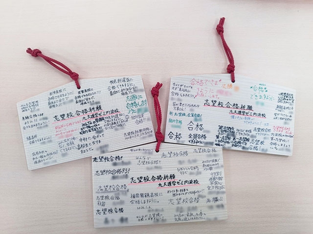 内浜校の中3生全員の合格を願い、子どもたちと教師一同で絵馬に各々の想いを込めました。